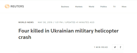 【环球网报道 记者 朱梦颖】据路透社刚刚消息,乌克兰军方5月30日发布消息称,当地时间29日晚,一架米-8军用直升机在乌克兰西部坠毁,机上4名飞行员遇难。