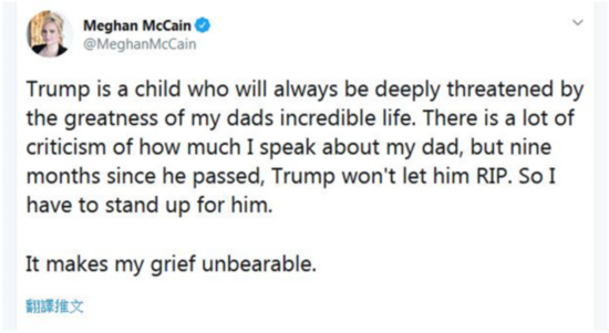 《华尔街日报》上述报道29日发布后,麦凯恩的女儿梅根·麦凯恩随即在推特上讽刺说,“特朗普就是一个一直被我父亲难以置信的人生深深威胁着的小孩。”她称,很多人批评自己说了太多关于父亲的话,“但自他去世9个月以来,特朗普不让他安息。所以我必须为他挺身而出。”她补充,“这让我的悲痛难以忍受。”