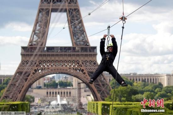资料图:当地时间5月28日,一名游客沿着800米长的路线从离地面115米高的巴黎埃菲尔铁塔二楼乘坐一条绳索顺势而下。