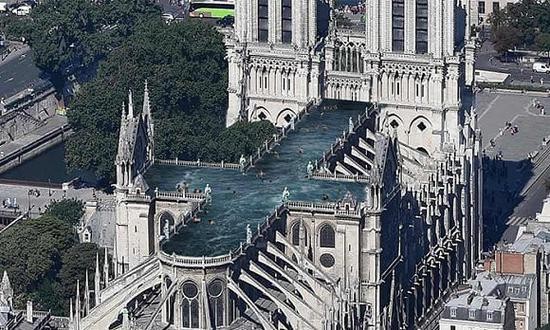 听到鼓励创新设计的声音后,设计师们提出了各种现代化方案,包括将圣母院屋顶改造为一个十字架形状的公共游泳池;在屋顶修建空中花园;修建可通电的玻璃塔尖。