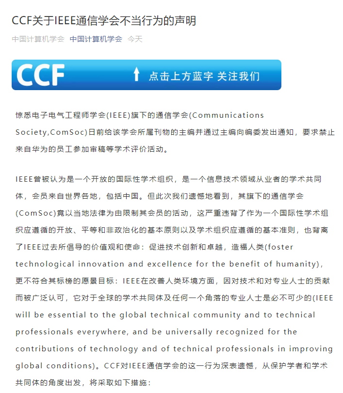 IEEE曾被认为是一个开放的国际性学术组织,是一个信息技术领域从业者的学术共同体,会员来自世界各地,包括中国。但此次我们遗憾地看到,其旗下的通信学会(ComSoc)竟以当地法律为由限制其会员的活动,这严重违背了作为一个国际性学术组织应遵循的开放、平等和非政治化的基本原则以及学术组织应遵循的基本准则,也背离了IEEE过去所倡导的价值观和使命:促进技术创新和卓越,造福人类(foster technological innovation and excellence for the benefit of humanity),更不符合其标榜的愿景目标:IEEE在改善人类环境方面,因对技术和对专业人士的贡献而被广泛认可,它对于全球的学术共同体及任何一个角落的专业人士是必不可少的(IEEE will be essential to the global technical community and to technical professionals everywhere, and be universally recognized for the contributions of technology and of technical professionals in improving global conditions)。CCF对IEEE通信学会的这一行为深表遗憾,从保护学者和学术共同体的角度出发,将采取如下措施: