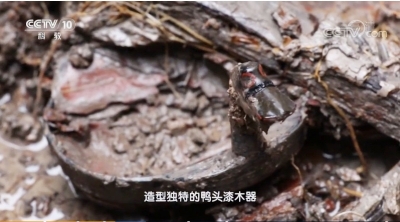将数十件形态各异的木俑提取出来之后,考古队员便开始专心细致地清理起下层的漆木器。终于,这件鸭头造型的漆木器被完整地提取出来。它不仅有长长的脖子,脖颈下方还绘有精美的翅膀羽毛图案,另有形似鸭蹼的部位,造型生动有趣。经过初步清理,考古队员发现鸭头造型漆耳杯的底部,还绘有“巨张”二字,红色的字迹在黑底漆面上十分醒目。
