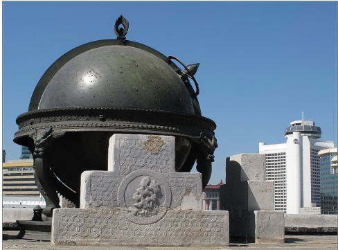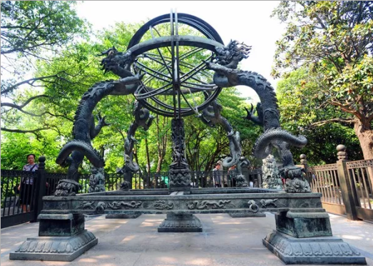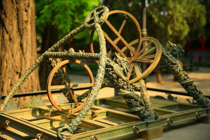 我国现存最早的浑象,制造于清康熙年间,位于北京古观象台,从外形上看,它是一个圆球。浑象还有浑天像、天体仪、天球仪几个别称,它是用来演示天体运动的,即把太阳、月亮、二十八宿(类似西方十二星座)等天体以及赤道和黄道都绘制在一个圆球面上,只要动动手,就能知道某一时刻的天象。当然张衡虽然不是浑象的发明者,但是通过他的改造,连动动手都不需要了,因为圆球能自己转动了。