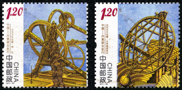 因为这个渊源,2011年,中国与丹麦联合发行了古代天文仪器邮票,一枚是郭守敬的简仪,另一枚就是第谷的大赤道经纬仪。