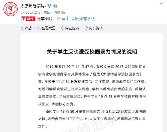 荔枝新闻讯 近日,微博上一则标题为“大二女生长期遭室友恐吓侮辱 被外传裸露视频致重度抑郁”的消息引发关注。太原师范学院5月30日深夜通过官方微博发布“关于学生反映遭受校园暴力情况的说明”,声明称,关于网友关心的微博中“潘同学长期遭受李同学暴力”的问题,经与当事人和周围宿舍人员、班干部等14人反复核实,4人在宿舍内常有相互嬉戏打闹的情形,的确存在玩笑过度的举动和言行不妥的情况,但并未发生过暴力行为,潘同学及其他3位舍友均对此表示认可。 详情>>