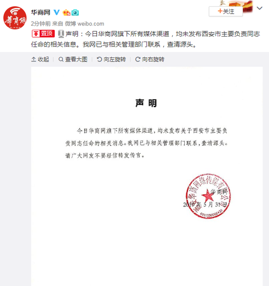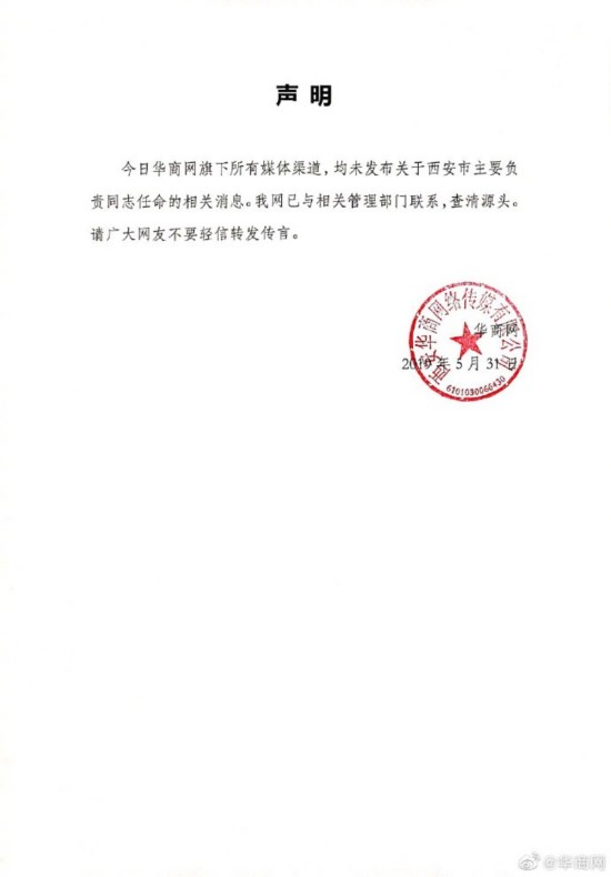 声明:今日华商网旗下所有媒体渠道,均未发布西安市主要负责同志任命的相关信息。我网已与相关管理部门联系,查清源头。
