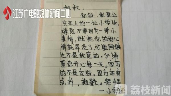 “叔叔你好,我是公交车上的一名小学生,请您不要因为一件小事情,就把你的好心情就弄没了,可能阿姨也不是故意的。希望你开心每一天。”署名小学生。