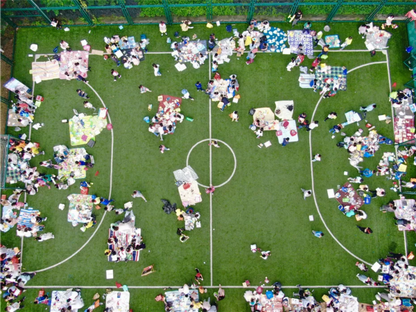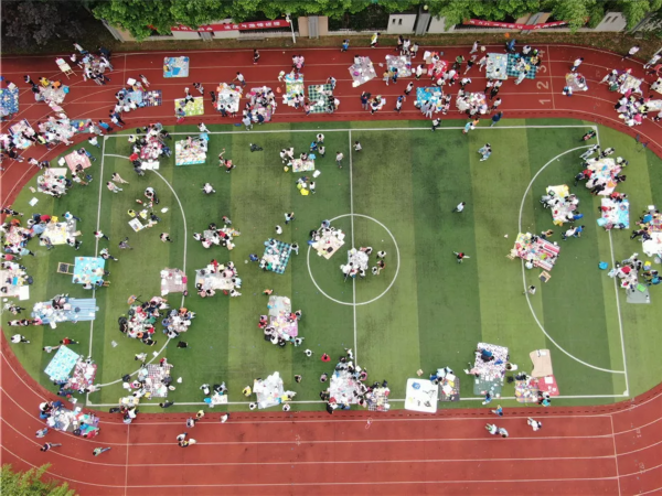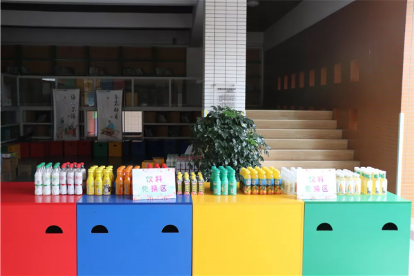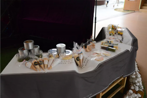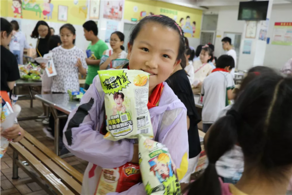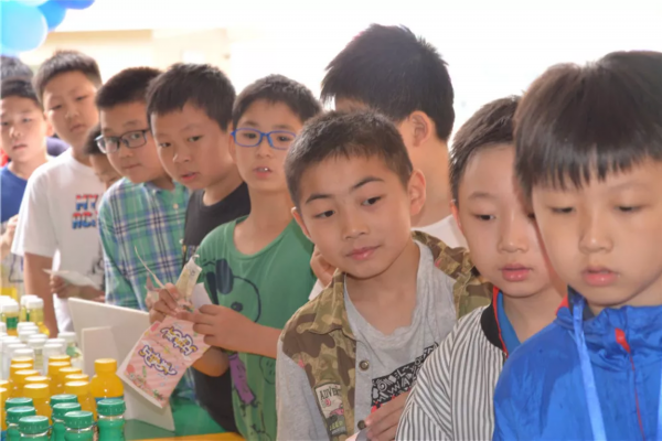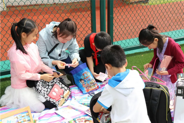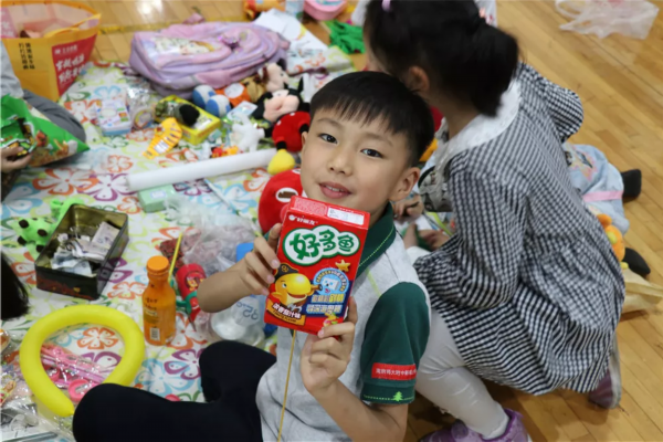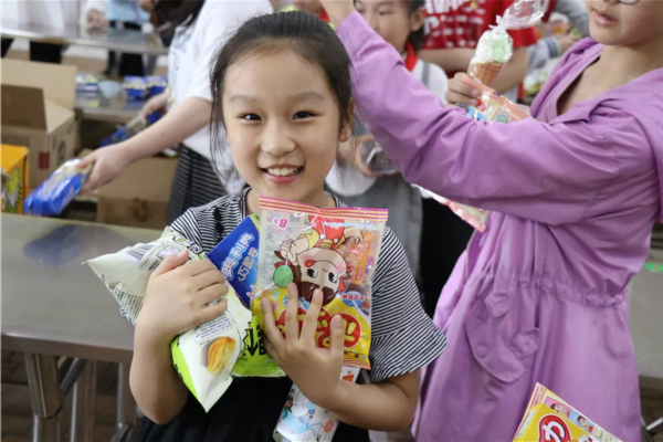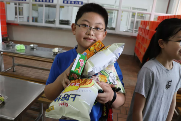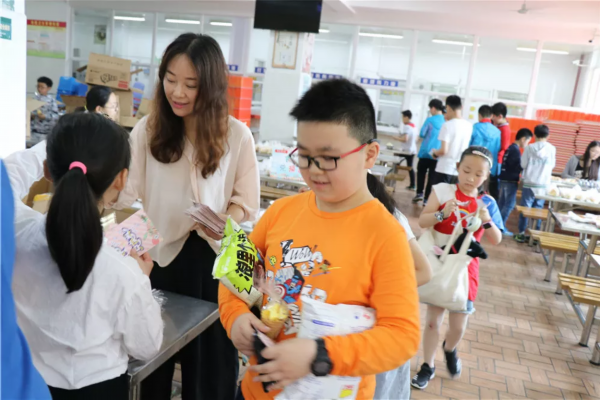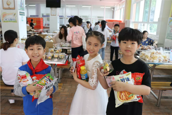 活动分为三个场地,一二年级在室内篮球馆;三四五年级在足球场和操场;六年级在“大脚丫”花坛处。这次的活动没有安排自制餐饮区,但老师们精心设置了食品兑换区。每个孩子凭着食品兑换券去自由选择美味健康的食品——蛋糕、西点、面包、巧克力、薯片……