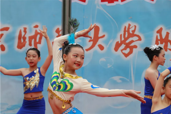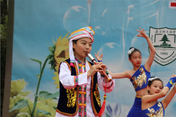表彰大会接近尾声时,四年级的部分队员用灵动的舞姿和动听的巴乌声演绎了一首《月光下的凤尾竹》,表达了对同学们的祝福。
