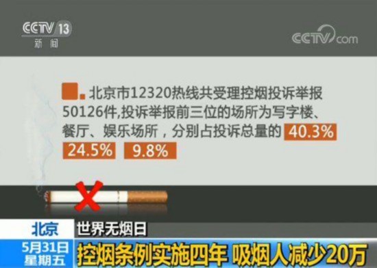 央视网消息:今天(31日)是北京市实行《控制吸烟条例》四周年,记者从北京市卫生健康委了解到,从《条例》实施以来,北京市12320热线共受理控烟投诉举报50126件,投诉举报前三位的场所为写字楼、餐厅、娱乐场所,分别占投诉总量的40.3%、24.5%、9.8%。
