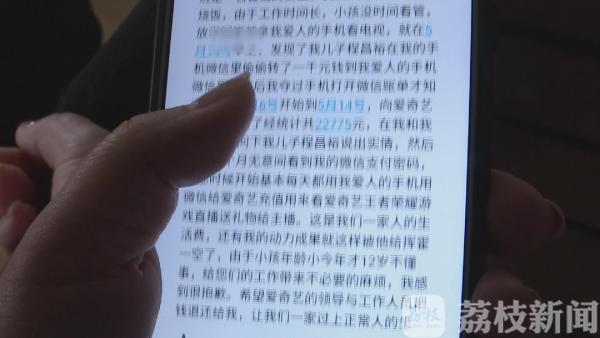 原以为儿子拿着手机只是看看视频、玩玩游戏,万万没有想到他竟然每天都在往网络平台上充钱,多则上百、少则几十。这让程其祯十分震惊,“小孩从四月份开始 ,就是看那个爱奇艺主播玩王者荣耀 ,给主播送礼物, 爱奇艺送掉了将近两万三千块钱 ,还有一个是腾讯,差不多充掉了七八千块钱 。”