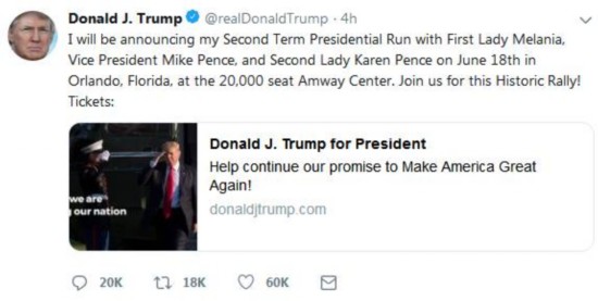 当地时间5月31日,特朗普在他的官方推特上写到:“我将与第一夫人梅拉尼娅、副总统彭斯及其夫人卡伦·彭斯,6月18日在佛罗里达州奥兰多市安利中心宣布第二次竞选总统。加入我们这次历史性集会吧!”↓
