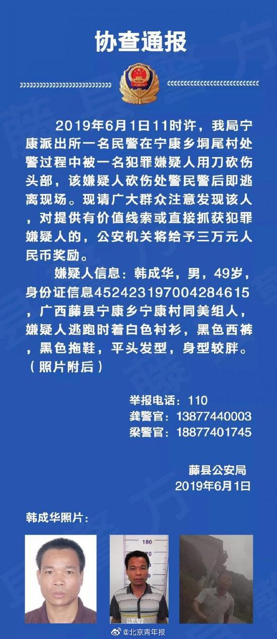 6月1日,广西藤县公安局官方发布协查通报称,6月1日11时许,藤县公安局宁康派出所一名民警在宁康乡垌尾村处警过程中被一名犯罪嫌疑人用刀砍伤头部,该嫌疑人砍伤处警民警后即逃离现场。现请广大群众注意发现该人,对提供有价值线索或直接抓获犯罪嫌疑人的,公安机关将给予3万元人民币奖励。据警方披露,该犯罪嫌疑人名为韩成华,男,49岁,广西藤县宁康乡宁康村同美组人,嫌疑人逃跑时着白色衬衫,黑色西裤、黑色拖鞋,平头发型,身型较胖。