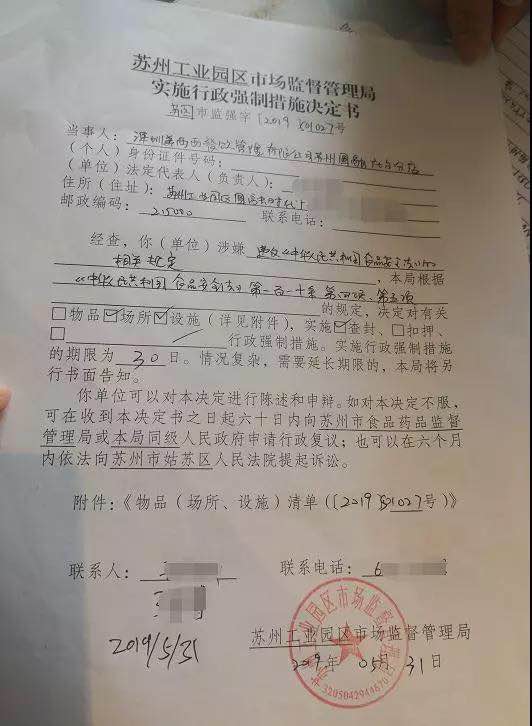北青报记者在苏州工业园区市场监督管理局开具的《实施行政强制措施决定书》中看到,该店涉嫌违反《中华人民共和国食品安全法》的相关规定,该局对店铺和设施实施了查封,期限为30天。