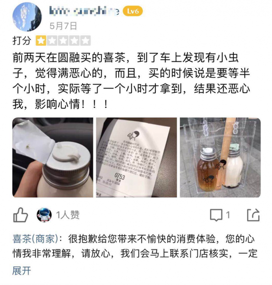 而在大众点评APP中,该店也显示暂停营业。北青报记者在该店的评价中看到,2019年5月7日有用户发布评论称在该店饮品的瓶盖部分发现小虫子,另有用户评论称在饮品中喝到不明黑色胶状物。