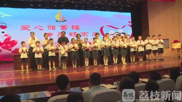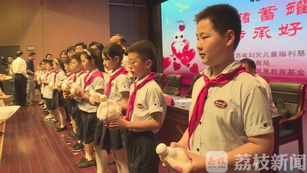 在江苏省妇女儿童基金会泗阳爱心储蓄罐项目启动仪式现场,30多名学生代表现场领取了爱心储蓄罐。10所小学校长分别认领100个爱心储蓄罐。