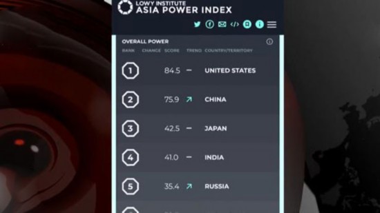 洛伊研究所5月8日发布的2019年“亚洲实力指数”,对日本、美国、中国和俄罗斯等亚太地区的25个国家及地区在8个领域的实力打分,满分100。美国在综合实力上得分84.5分,排名榜首,“维持卓越实力”。中国以75.9分排名第二,日本共同社评论称中国是“迅速逼近美国的正在崛起的超级大国”。 日本、印度和俄罗斯分列第三、四、五位。