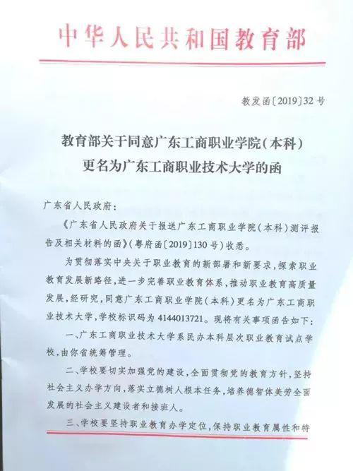 5月27日,教育部致函省人民政府,同意广东工商职业学院(本科)更名为广东工商职业技术大学,系全国民办本科层次职业教育试点学校,代码为4144013721,并批准10个本科招生专业,今年正式启动招生。