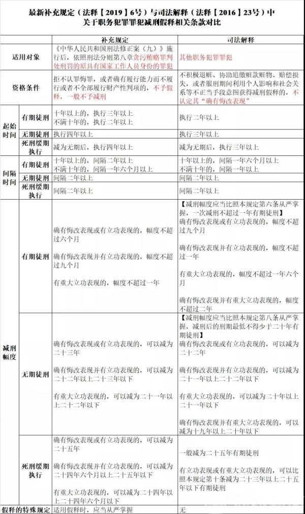 总体来看,相比于法释【2016】23号《最高人民法院关于办理减刑、假释案件具体应用法律的规定 》的对应条款,最新的补充规定(法释【2019】6号)在减刑的资格条件、起始时间、间隔时间和减刑幅度上都作了更加严格的规定。