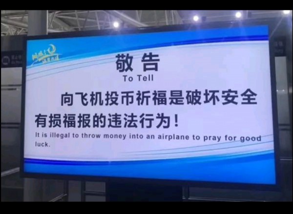 此前,据媒体报道,机场工作人员称“有损福报”是为了通过活泼俏皮的语境提醒旅客不扔硬币,部分人投硬币就是为了求个平安,这么说更能引起大家的注意和正视。