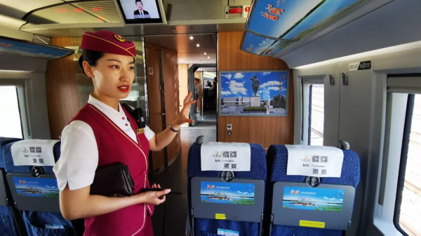 据悉,盐城北至北京南和盐城北至石家庄的动车组列车为套跑重联车辆,即两组8节短编组列车联在一起开行。北京南至盐城北的列车至达盐城北后直接开往石家庄,而石家庄至盐城北的列车到达盐城后直接开往北京南,一趟列车要经过几十个不同的城市。“目前日均发运旅客近3000人次,从北京开往盐城的车上,我看到不少旅客在扫描枕巾上的二维码,很多人都知道了‘一个让人打开心扉的地方’。”王海珍说。