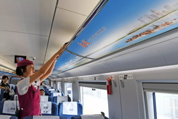 动车组列车内每节车厢内都张贴着三幅盐城景区美图,列车视频里也在播放宣传盐城的视频。这些车内全媒体广告的冠名,包括头枕巾、小桌板、展板、行李架贴、车门贴、车内LED、列车广播和列车视频。“除了这些,甚至列车到站时,提示语播报的内容也跟盐城有关,为‘黄海湿地号动车组列车提醒您,前方到站XX站’。”王海珍说。