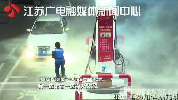 正在给一辆摩托车加油的徐媛萍看到了冒火的车辆,她一边让车主赶紧带着孩子逃出汽车,一边大声呼救。