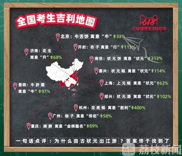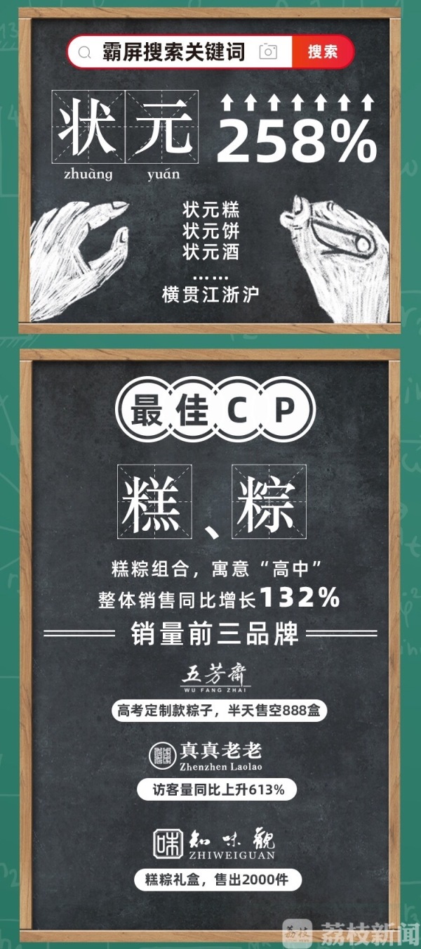 数据显示,“状元”一词在过去半月内搜索量同比上升258%,成了霸屏搜索词。状元酒、状元糕、状元饼……状元系列产品热卖,成了江浙沪考生的吉利神器。