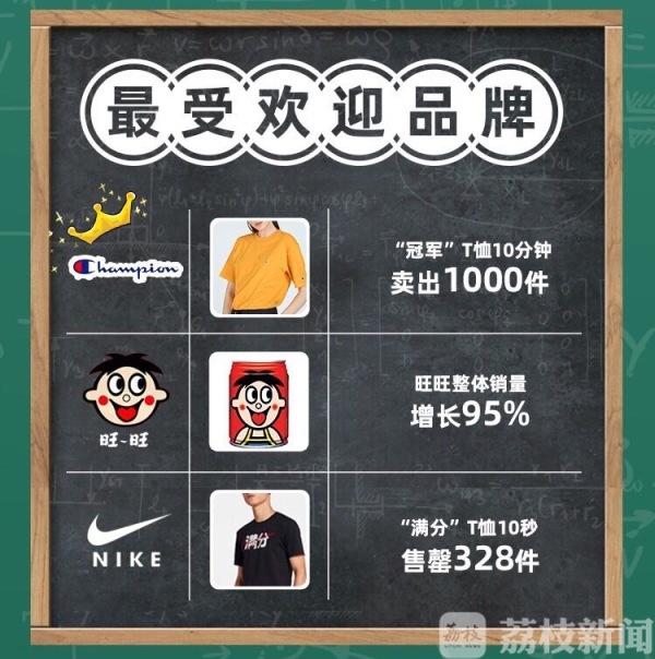 穿Nike不穿特步(因为特步的标志是一个叉号),似乎是考生们的一个共识。耐克一款印有“满分”字样的限量T恤,6月1日天猫618首日零点刚过10秒钟,就售罄了328件。