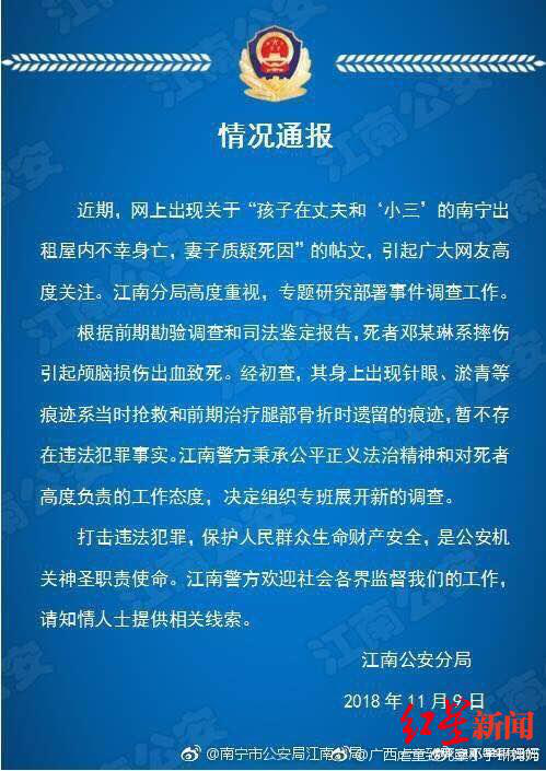 2018年11月9日,江南分局发布通报称,邓子琳身上出现的淤青、针眼等痕迹,系当时抢救和前期治疗腿部骨折时遗留的痕迹,暂不存在违法犯罪事实。