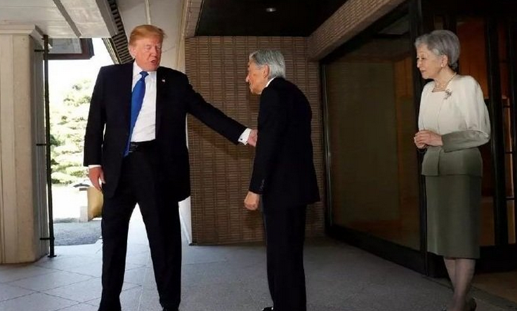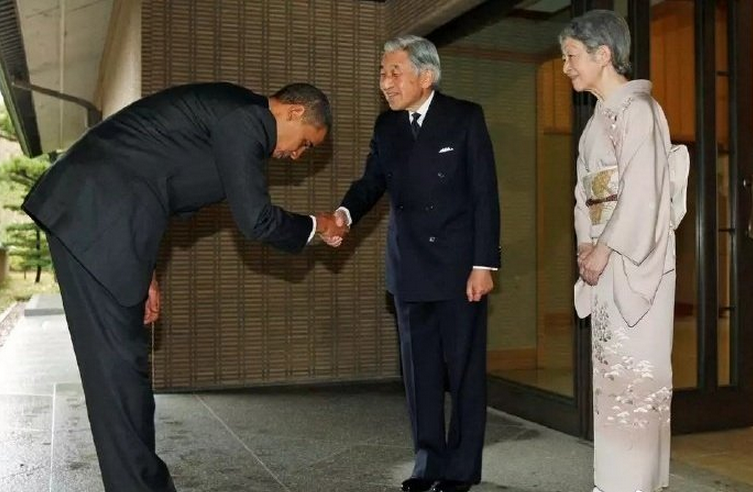 写这稿时,环环想起了当初特朗普和奥巴马访问日本,会见日本明仁天皇时的场景↓