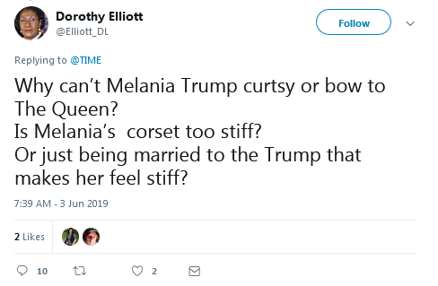 Dorothy:为什么梅拉尼娅·特朗普不能向女王行屈膝礼或鞠躬?是因为她的衣服太紧吗?