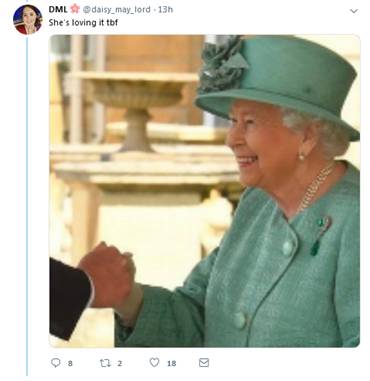 有网友注意到,在被特朗普像“打拳”般行礼后,女王是面带微笑的↓