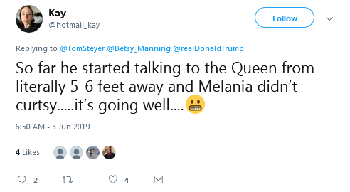 Kay:到目前为止,他(特朗普)开始从5-6英尺远的地方与女王交谈,而梅拉尼娅没有行屈膝礼……一切“进展顺利”……