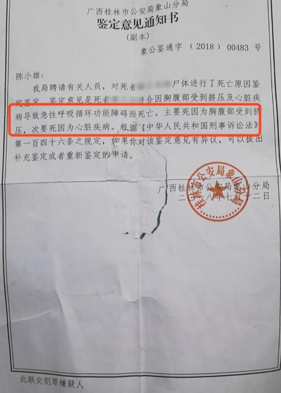 桂林市公安局象山分局出具的鉴定意见通知书显示,黄海(化名)主要死因为胸腹部受到挤压。 受访者供图
