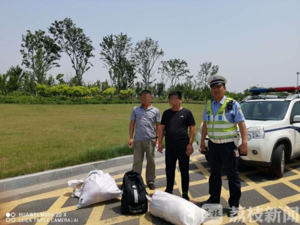 10时30分左右,盐城高速二大队警辅陈桂军、徐文灿巡组巡逻至沈海高速由北向南方向996公里路段,发现两名男子正拖拽着几只笨重的蛇皮袋及行李包,翻越中央隔离绿化带及护栏,行车道上疾行车辆不断,十分危险。