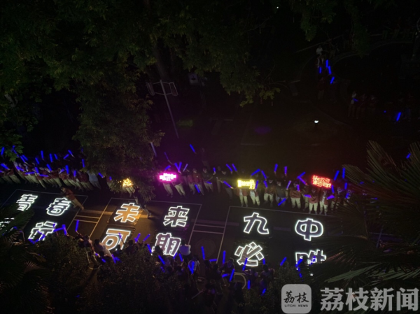 在南京第九中学,高一、高二的学弟学妹们带着五彩荧光棒,为高三学长学姐们“喊楼”。一声声祝福寄托最美好的祝愿。教室外的走廊,楼下是一辆“发光”的“必胜号”列车,相信他们可以乘着这辆列车,驶向心仪的大学,通往梦想的远方。