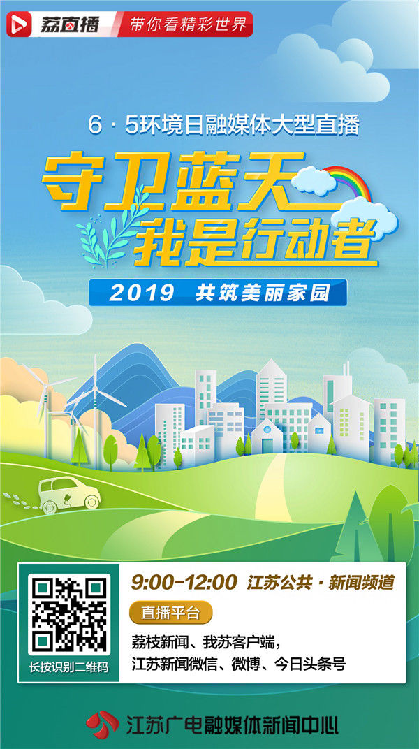 今天上午9点至12点,江苏广电总台融媒体新闻中心,江苏公共·新闻频道推出六五环境日融媒体大型直播《守卫蓝天 我是行动者—2019•共筑美丽家园》。