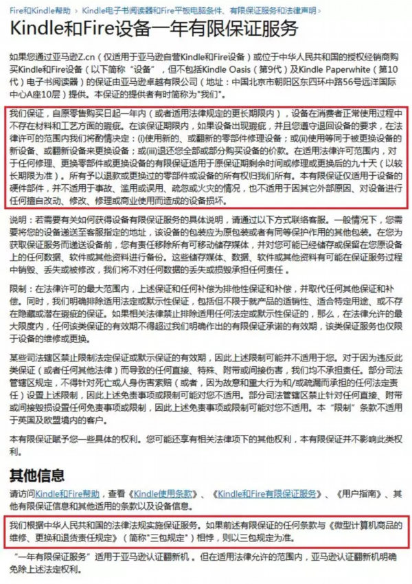 亚马逊公司明确表示其旗下kindle系列产品售后有限保证仅适用于设备的硬件部件,不涉及软件问题。