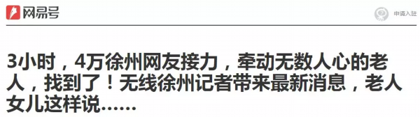 为找到老人,各救援队、志愿者、热线市民组成了临时微信群,徐州广电传媒集团也通过无线徐州微信公众号发布了寻人信息,3个小时内,23万网友阅读了这条信息,4万多人进行了转发,爱心接力!6月2日晚19点,通过全城动员寻人,老人找到了!