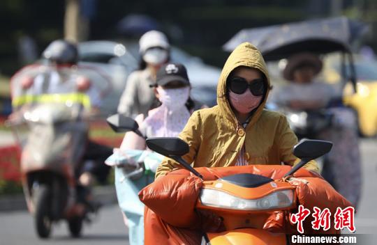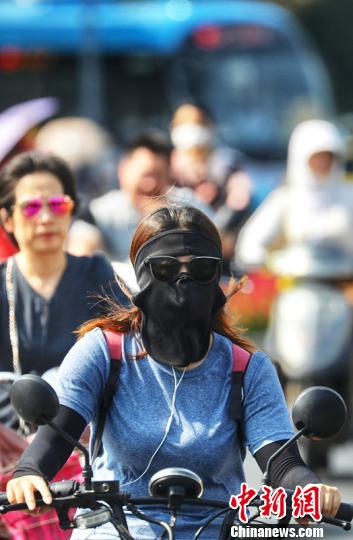 在南京,“防晒神器”登上街头。不少选择电动车、自行车出行的市民将头部和四肢裹的严丝合缝,以防止被高温灼伤,整个身体仅露出两只眼睛“探路”。