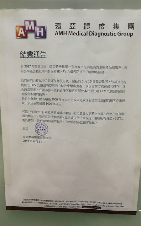 该声明称,环亚体检集团公司户口两星期前被银行冻结,公司负责人深陷官司纠纷,因此“宣告清盘结业”,并遣散所有员工。环亚体检集团已为超过2000多位未使用或未完成疫苗注射的顾客做出退款,涉及金额超过1000万港币。