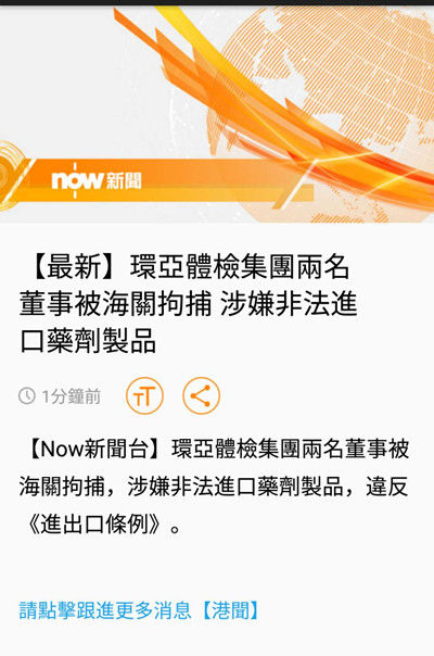港媒6月5日最新报道,环亚体检集团两名董事被香港海关拘捕,涉嫌非法进口药剂制品,违反进出口条例。