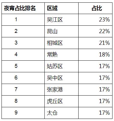 在苏州各个区县当中,最偏好夜宵的前三区分别是吴江区、昆山和相城区,夜宵订单占比均超过20%。