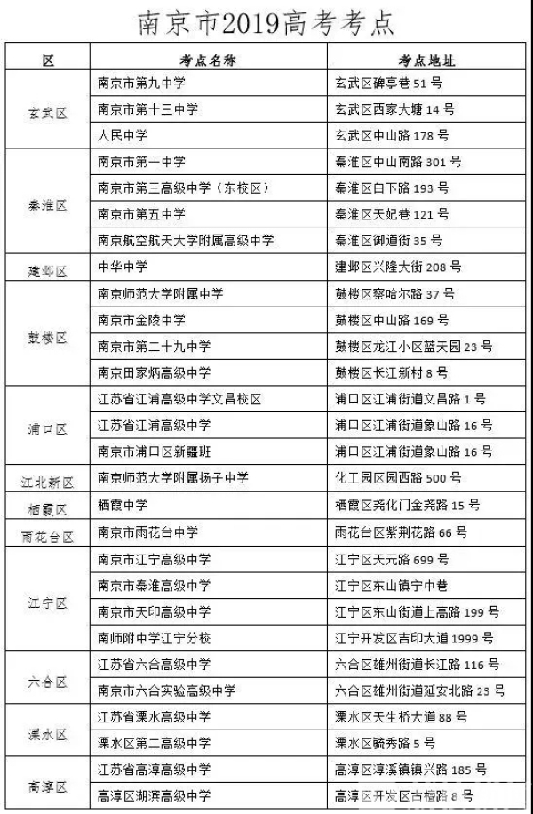 鼓楼区考点:南师附中、金陵中学、二十九中、田家炳高级中学
