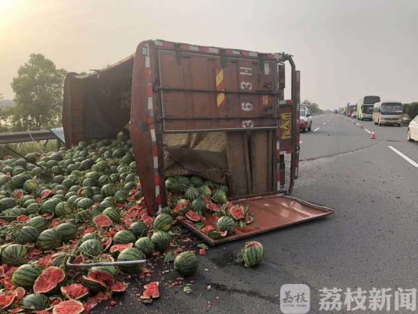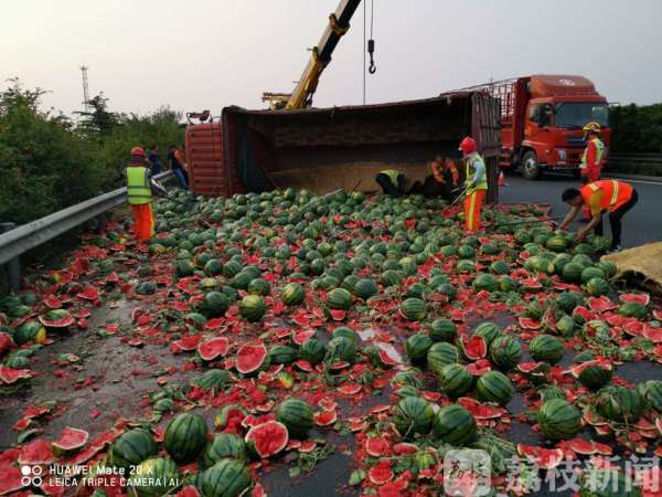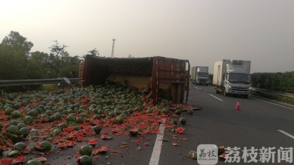 6月4日傍晚7点多钟,在沈海高速射阳县境内的978号桩附近路段,一辆由北向南行驶的装运西瓜货车突然爆胎,车辆失去控制,与路边护栏发生碰刮后侧翻,车上装载的七吨多西瓜全部倾倒在路面上,占据了第二、第三和应急车道。