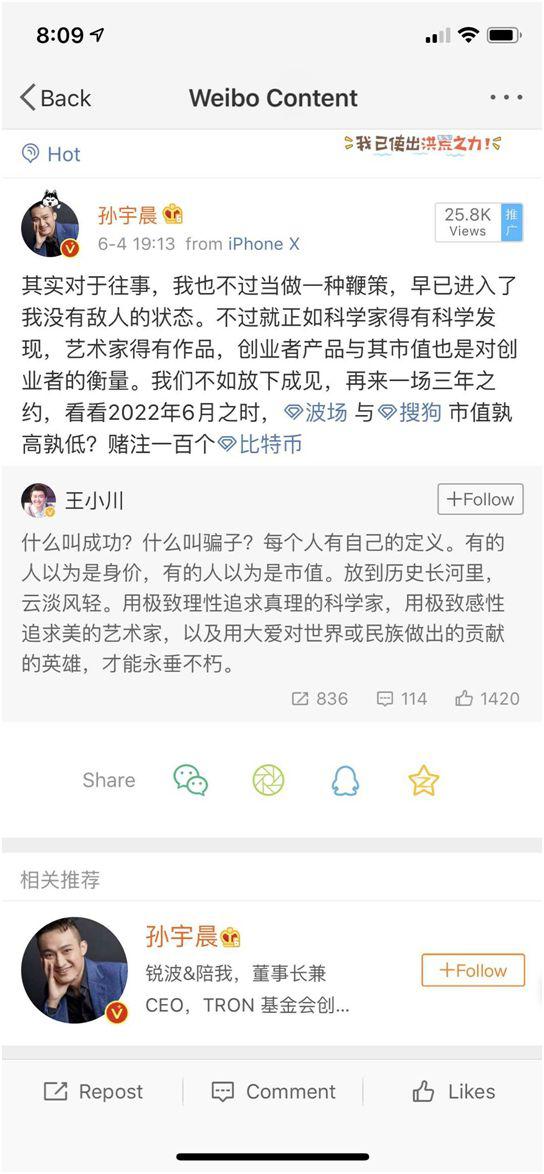 孙宇晨则在微博回怼王小川,其称,对于往事我也不过当做一种鞭策,早已进入了没有敌人的状态,不过就正如科学家得有科学发现,艺术家得有作品,创业者产品与其市场也是对创业者的衡量,我们不如放下成见,再来一场三年之约,看看2022年6月时,波场于搜狗市值孰高孰低,赌注为100个比特币。
