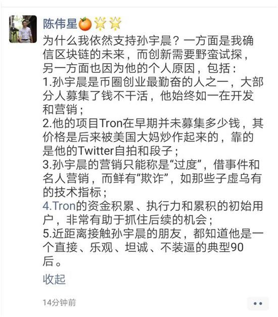 孙宇晨遭到创投圈大佬们的“围攻”,但在币圈,依然有不少人支持他。专注于投资区块链项目以及虚拟货币的泛城资本创始人陈伟星在朋友圈表示,“为什么我依然支持孙宇晨?一方面是我确信区块链的未来,而创新需要野蛮探索;另一方面也是因为他个人原因,包括孙宇晨是币圈创业最勤奋的人之一,孙宇晨的营销只能称是‘过度’,而鲜有‘欺诈’比如那些子虚乌有的技术指标”。