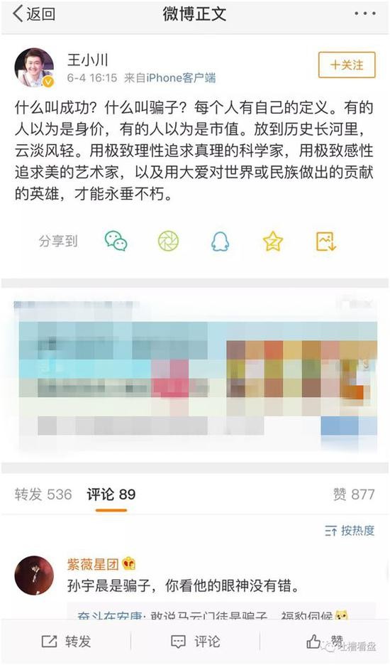 6月4日,搜狗创始人王小川在微博上表示,什么叫成功?什么叫骗子?每个人都有自己的定义。有的人以为是身价,有的人以为是市值,放到历史的长河里,云淡风轻。用极致理性追求真理的科学家,用极致感性的追求美的艺术家,以及用大爱对世界或民族作出的贡献的英雄,才能永垂不朽。