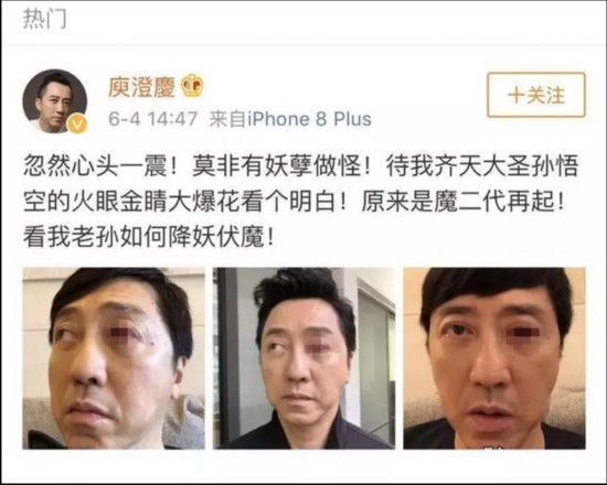 6月4日14:47,庾澄庆在微博上发了3张自拍,照片中他的左眼充血,眼白全被染红,情况上看上去比较严重,非常吓人。粉丝纷纷留言,让哈林哥注意身体。